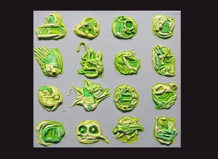 epoxy putty, found objects, acrylic on canvas